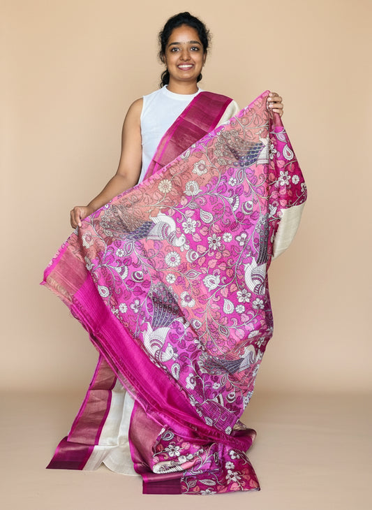 Cream and Magenta Tussar Silk Saree with Prints