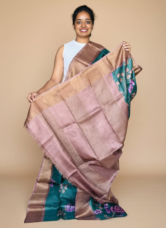 Dark Green Tussar Silk Saree with Prints