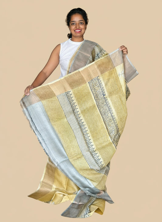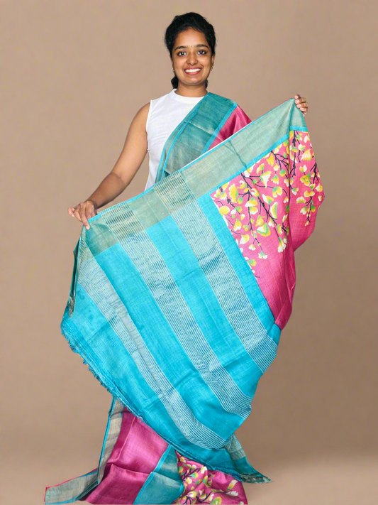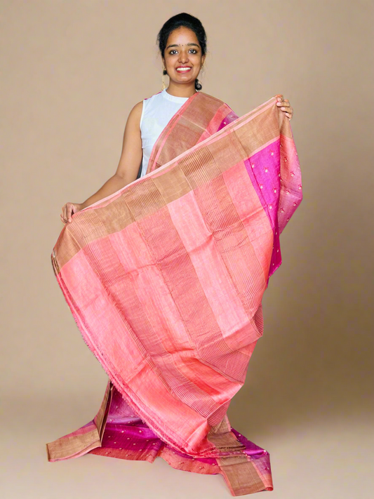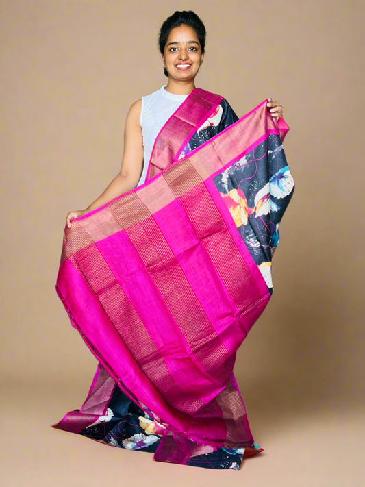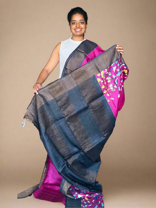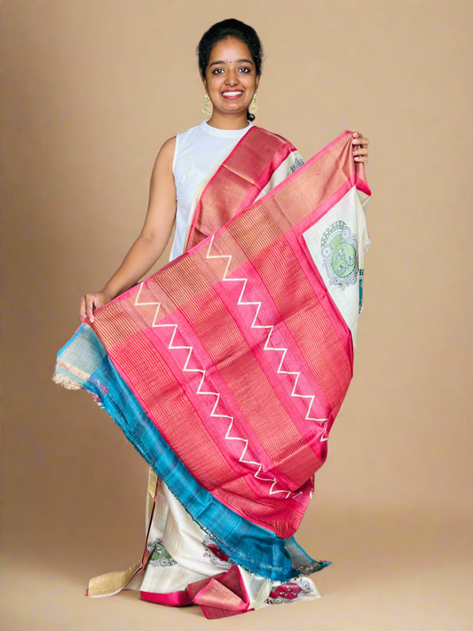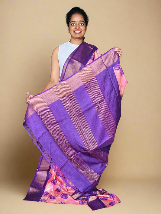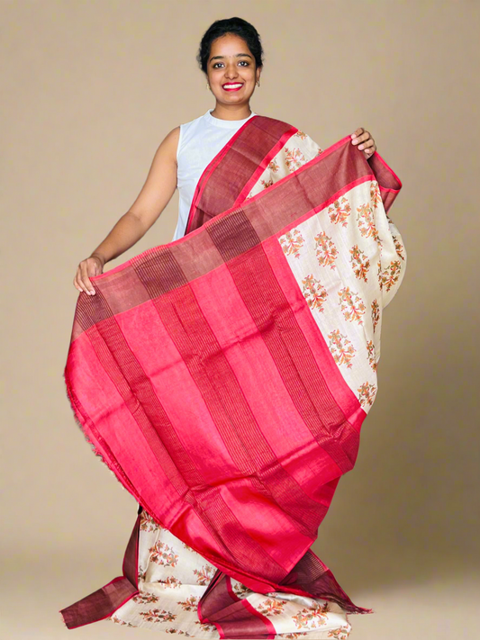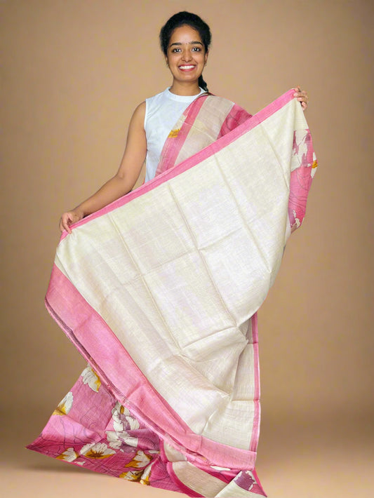 Cream Pink and Purple Tussar Silk Saree with Prints