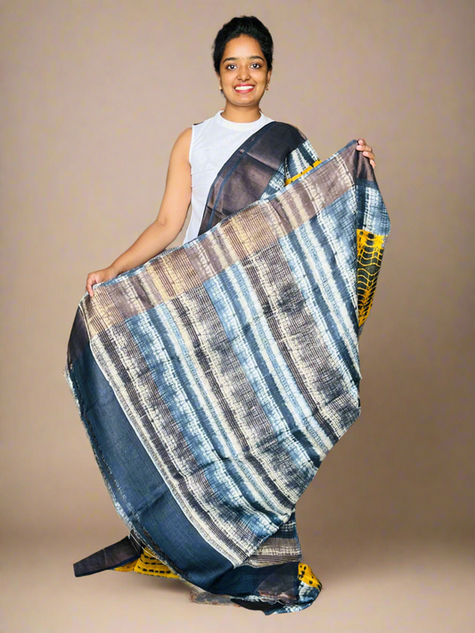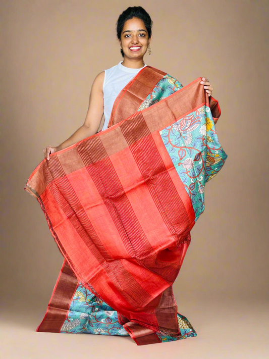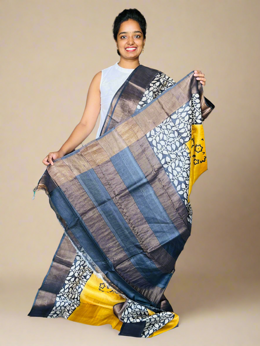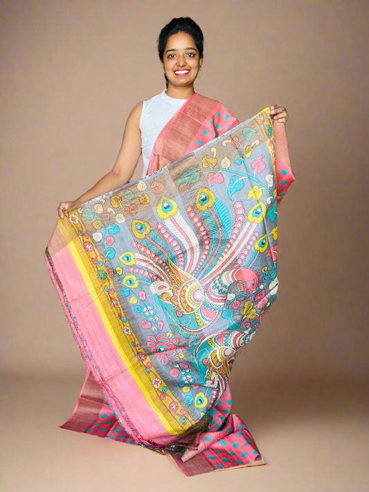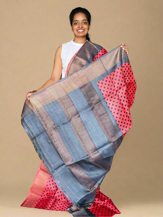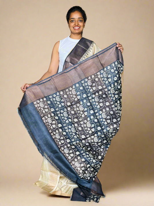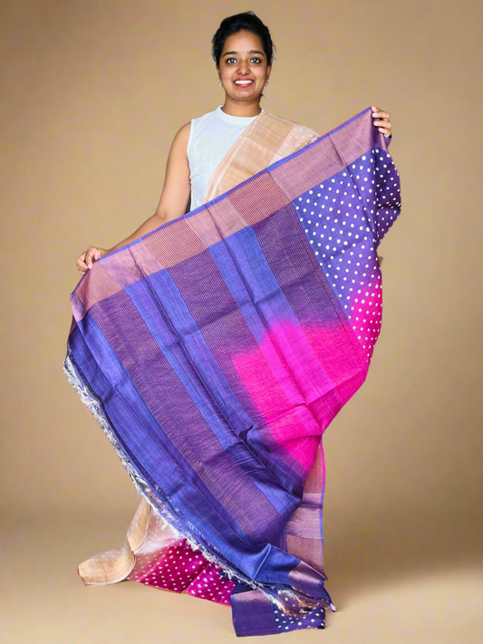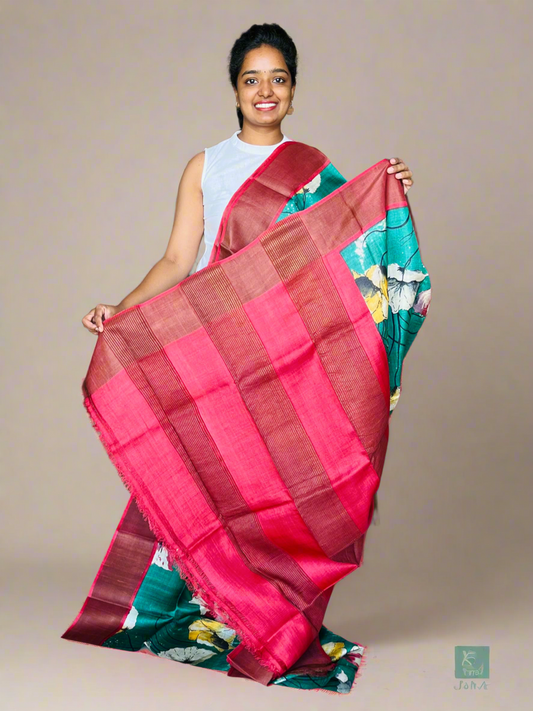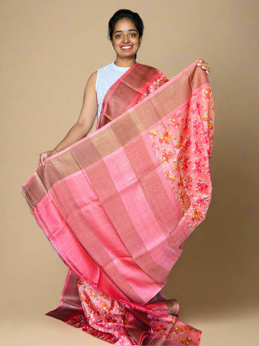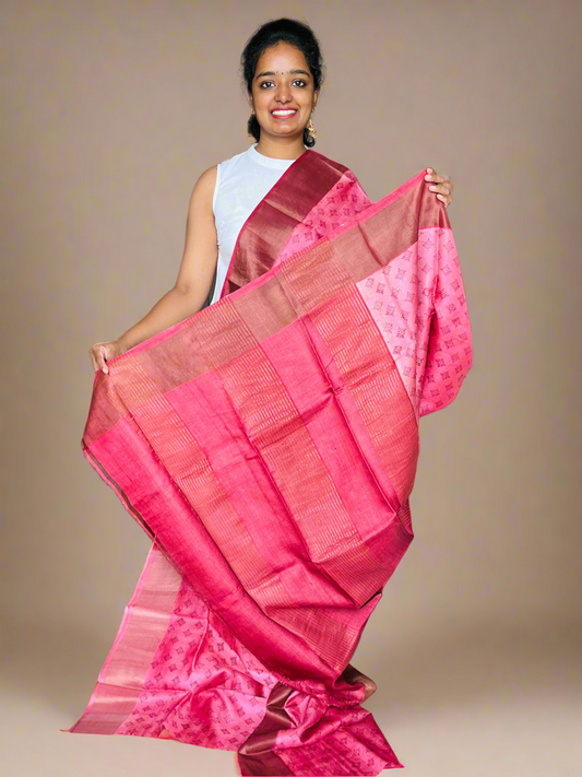 Cream Pink and Purple Tussar Silk Saree with Prints