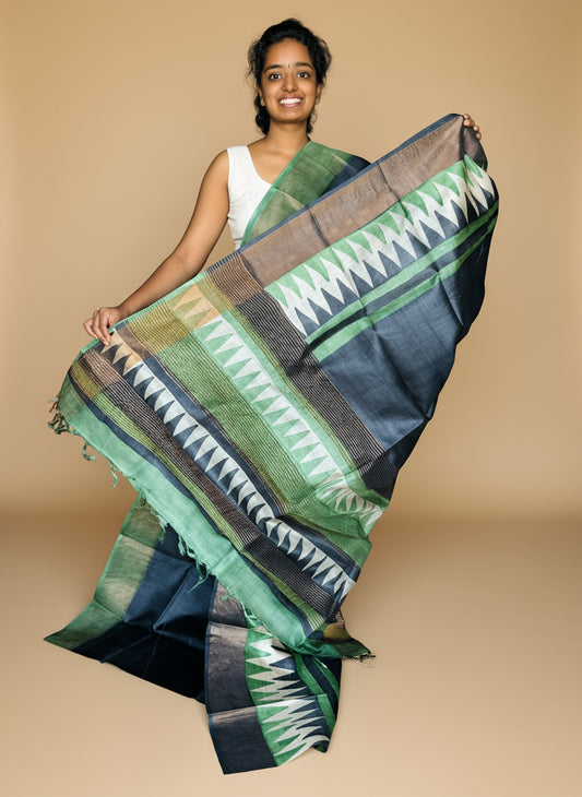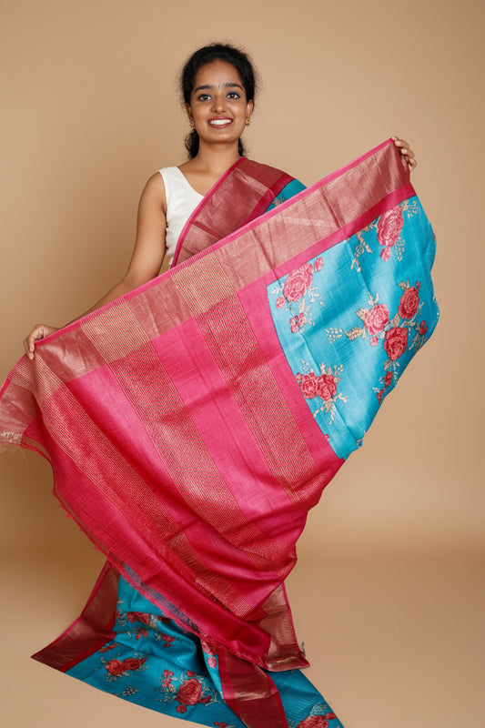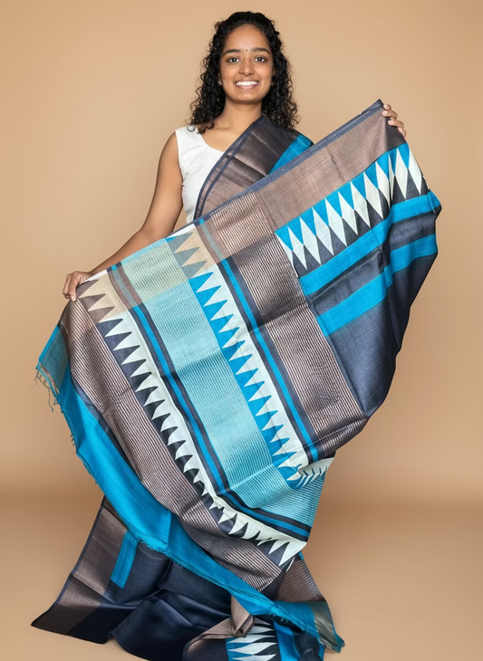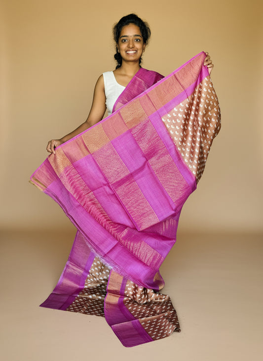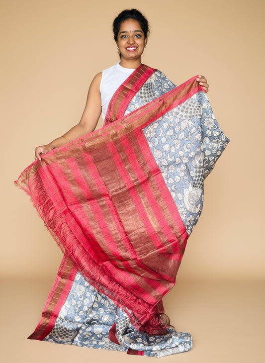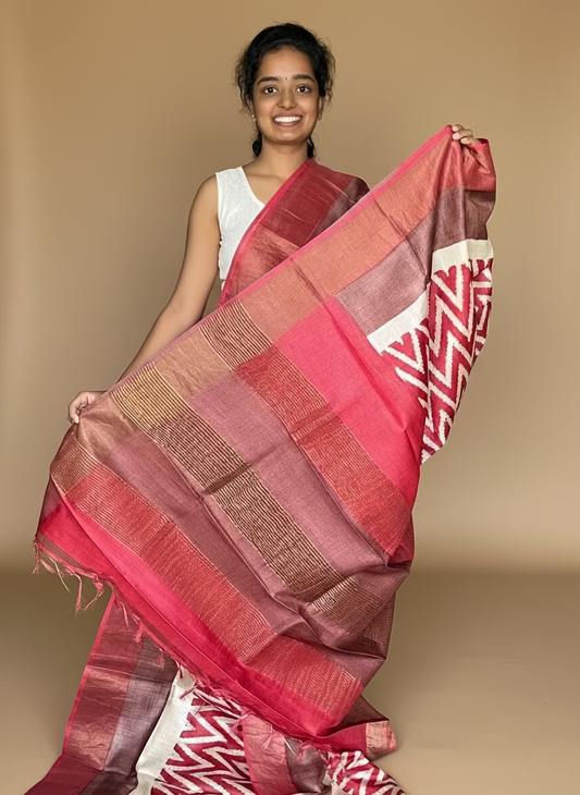 Cream, Red and Brown Tussar Silk Saree with Prints