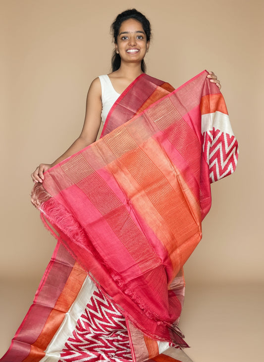 Cream, Red and Orange Tussar Silk Saree with Prints